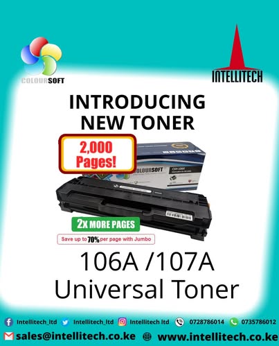 Introducing our latest ColorSoft compatible toners - models 106A/107A. High-quality universal toners with exceptional page yield of 2,000 pages. Save up to 70% per page with our jumbo cartridges.
