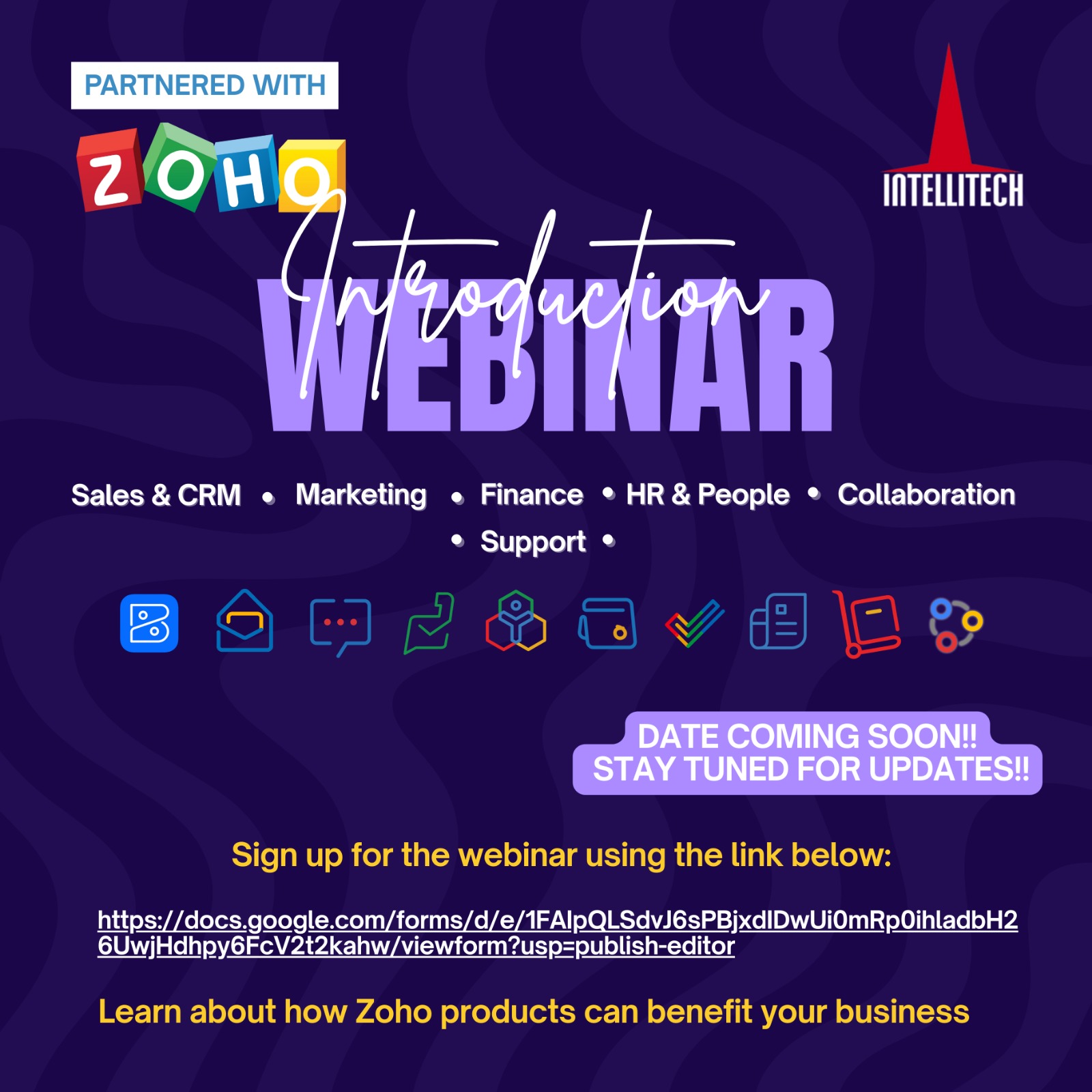 Ready to streamline your business operations and boost your team's productivity? Join Intellitech and Zoho for an exclusive introduction webinar where we'll explore how Zoho's powerful suite of tools - from Sales and CRM to Finance and HR - can transform the way you work. Click below to register.